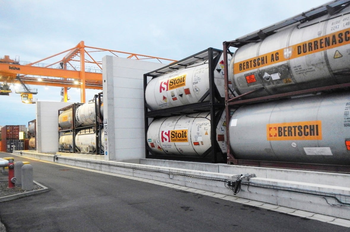Bertschi posee 37,800 contenedores cisterna y silo, 1,100 camiones y 30 terminales de contenedores. La empresa es líder del mercado en Europa en el transporte intermodal de productos químicos por ferrocarril, carretera y agua, así como un proveedor líder mundial de transporte de contenedores cisterna y servicios logísticos de valor añadido complementarios para la industria química. Los lugares importantes fuera de Europa son Shanghái, Singapur, Houston, Moscú, São Paulo, Dubái, Al-Jubail (Arabia Saudita) e Estambul. Foto: © Bertschi / Título de la leyenda de la imagen principal: Terminal Bertschi Róterdam (NL)