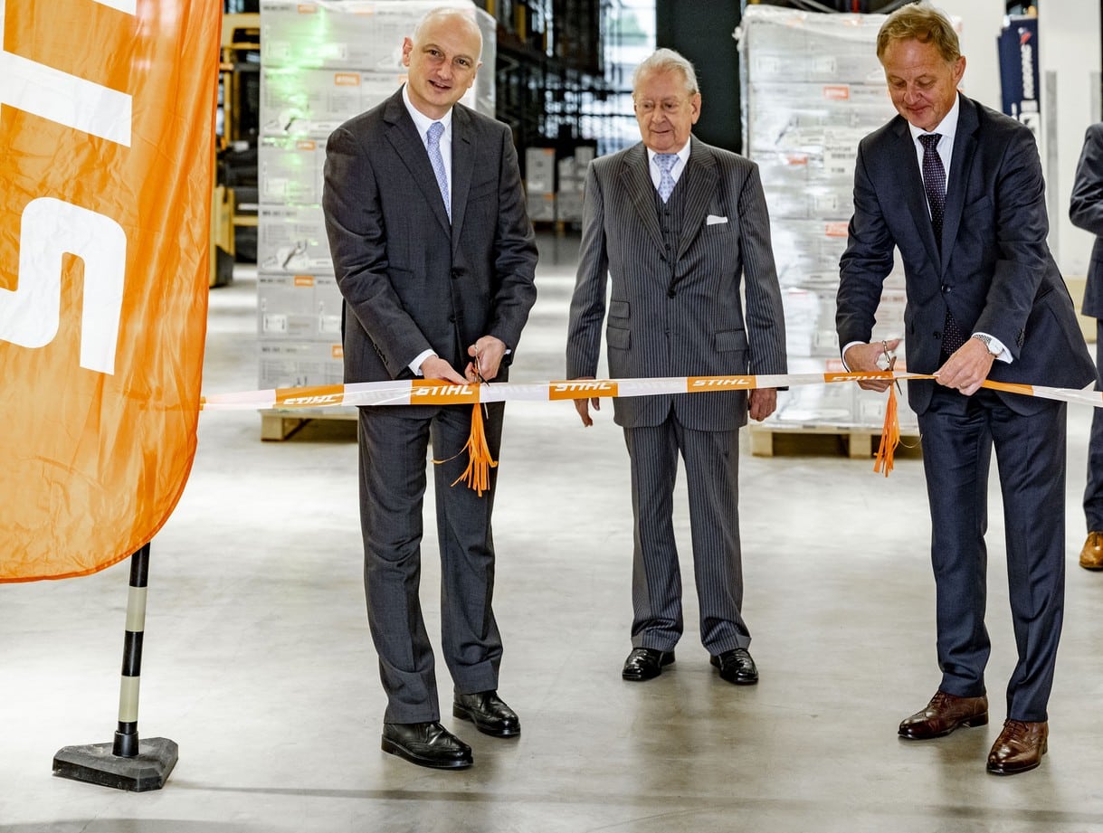 de izquierda a derecha: Dr. Nikolas Stihl, presidente del consejo asesor y del consejo de supervisión, Hans Peter Stihl, presidente honorario del consejo asesor y del consejo de supervisión, y Heribert Benteler, director general de la central de ventas de STIHL en Dieburg, inauguran oficialmente el nuevo edificio logístico.