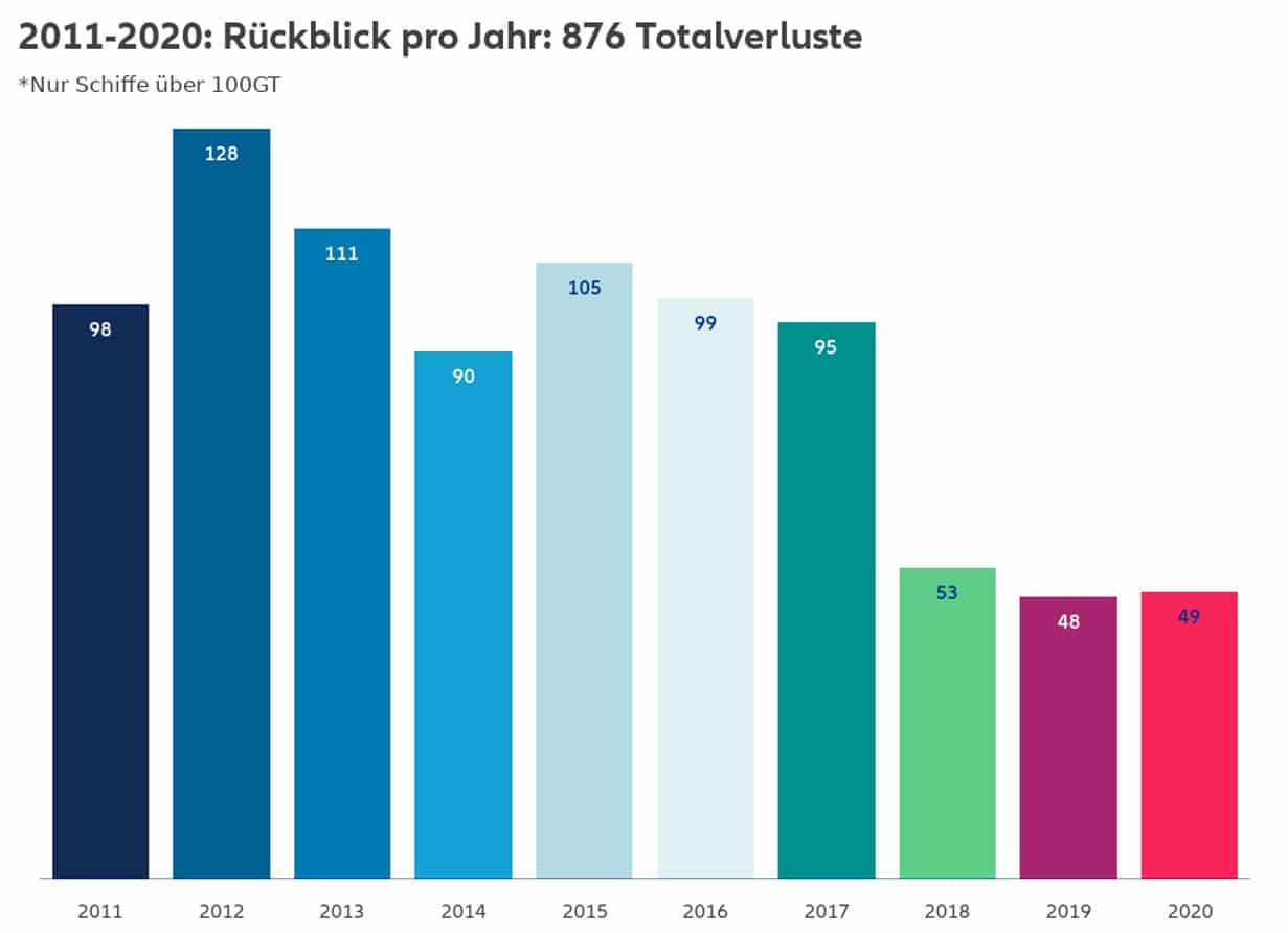 L’étude annuelle de l’AGCS analyse les pertes et accidents de navires signalés (incidents) de plus de 100 tonneaux de jauge brute. En 2020, 49 pertes totales de navires ont été signalées dans le monde, similaire à l’année précédente (48) et le deuxième nombre le plus bas de ce siècle. Cela représente une diminution de 50 % au cours des dix dernières années (98 en 2011). Le nombre d’accidents de navires a diminué de 2 818 à 2 703 en 2020 (soit une baisse de 4 %). Au cours des dix dernières années, il y a eu plus de 870 pertes de navires au total.