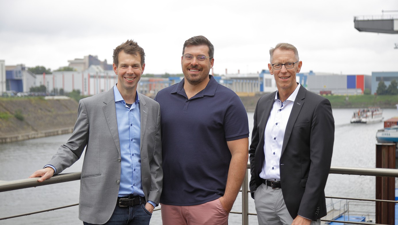 Photo : © Rheinports / Légende de l’image : L’ancien directeur général de RheinPorts, Felix Harder (à gauche), va désormais, avec Aurel Wernli et Joachim Holstein (à droite), faire avancer la transformation numérique de la navigation intérieure