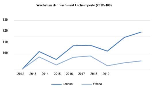 La crescita più significativa è stata quella delle importazioni di salmone: in otto anni, le importazioni di salmone sono aumentate del 25%, passando da 11’000 a 14’000 tonnellate. Rispetto alle importazioni totali di pesce, le importazioni di salmone sono cresciute cinque volte più rapidamente, aumentando la loro quota di 6 punti percentuali, dal 34% al 40%.
