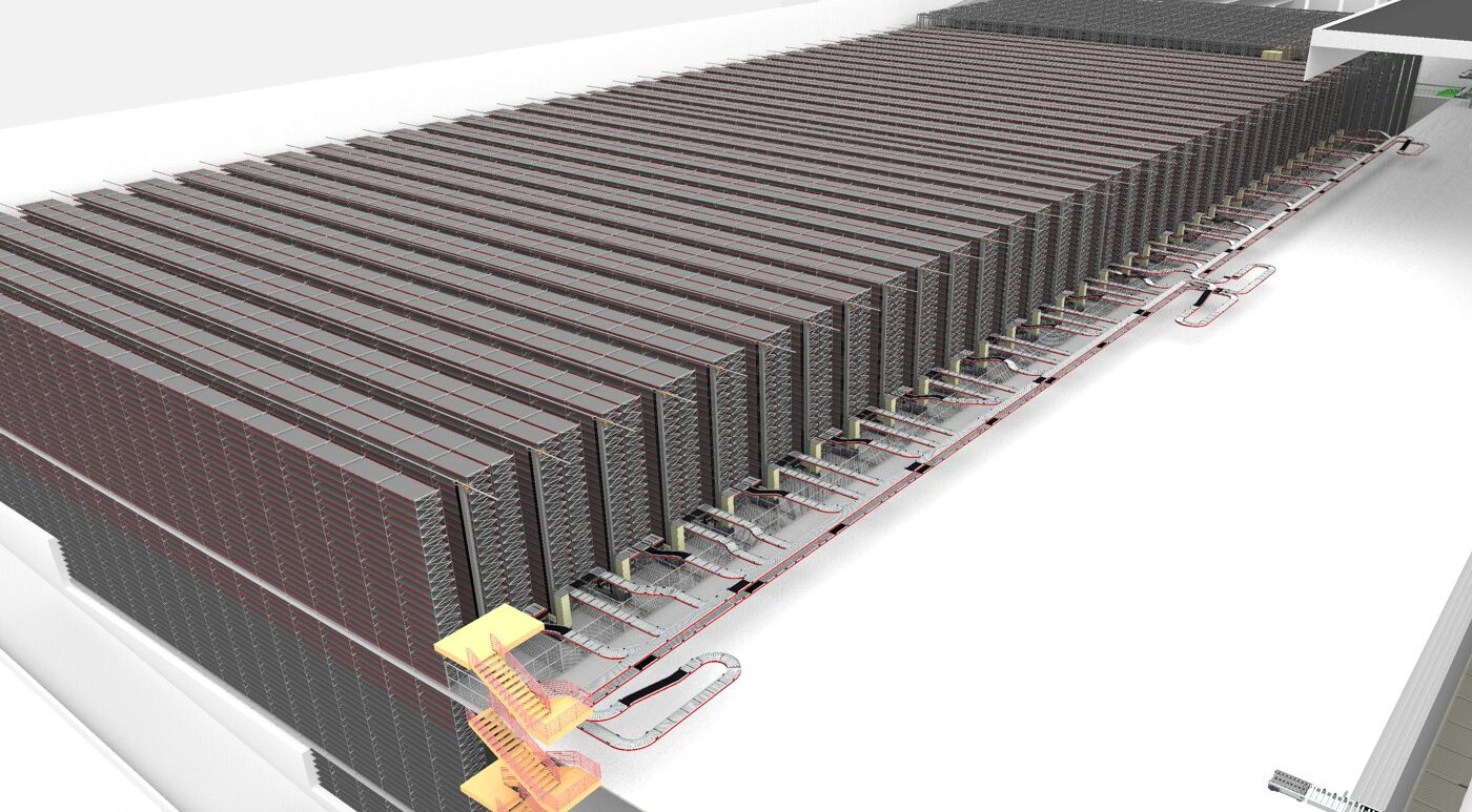Ciò che rende la soluzione di TGW Logistics tecnologicamente unica: 102 dispositivi di stoccaggio Mustang E+ saranno installati su tre livelli sovrapposti, rendendo il blocco di stoccaggio alto quasi 40 metri. Questa configurazione consente un’alta densità di stoccaggio con prestazioni ottimali, su misura per le esigenze di Ekol e dei suoi clienti. Una rete di quattro chilometri di tecnologia di trasporto energeticamente efficiente per cartoni e pallet collega le diverse aree tra loro – nell’intero impianto sono installati circa dieci chilometri di tecnologia di trasporto.