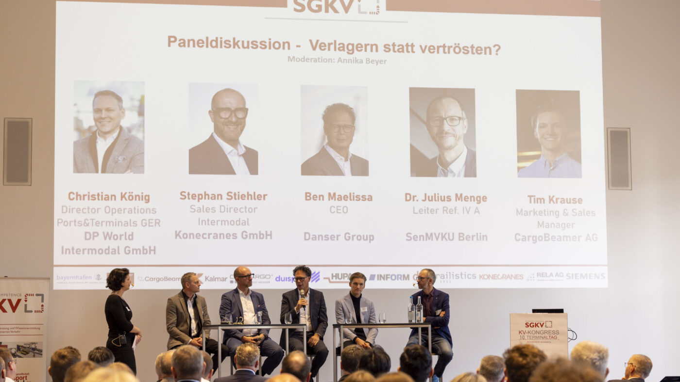 La successiva discussione del panel, moderata da Annika Beyer (SUT), con la partecipazione di Christian König (DP World), Ben Maelissa (Danser Group), Stephan Stiehler (Konecranes), Tim Krause (CargoBeamer) e Dr. Julius Menge (SenMVKU Berlino) ha messo in evidenza le condizioni sfidanti – tra cui numerosi ritardi dei treni e effetti di retrocessione osservabili sulla strada. Allo stesso tempo, c’era unanimità tra i partecipanti al dibattito: il KV dispone di un prodotto forte ed è un’alternativa di trasporto particolarmente ecologica. Ora è necessario rendere questi vantaggi ancora più visibili e creare soluzioni pragmatiche per affrontare le attuali problematiche insieme.