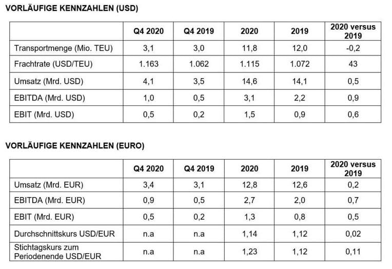 (Hamburg) In het boekjaar 2020 en op basis van voorlopige cijfers heeft Hapag-Lloyd zijn resultaat vóór rente, belastingen en afschrijvingen op immateriële activa en materiële vaste activa (EBITDA) verhoogd tot meer dan 3 miljard USD (ongeveer 2,7 miljard euro). Het resultaat vóór rente en belastingen (EBIT) groeide tot ongeveer 1,5 miljard USD (ongeveer 1,3 miljard euro). Beide cijfers liggen daarmee binnen de laatst gepubliceerde resultaatprognose voor het boekjaar 2020. Belangrijke drijfveren van deze positieve bedrijfsontwikkeling waren betere vrachtprijzen en lagere bunkerprijzen, evenals kostenbesparingen van ongeveer 500 miljoen USD, dankzij een succesvolle uitvoering van het Performance Safeguarding Program. In de EBIT zijn ook eenmalige kosten van ongeveer 140 miljoen USD (ongeveer 120 miljoen euro) in het vierde kwartaal van 2020 opgenomen, die vooral voortkomen uit de optimalisatie van de scheepsportefeuille.