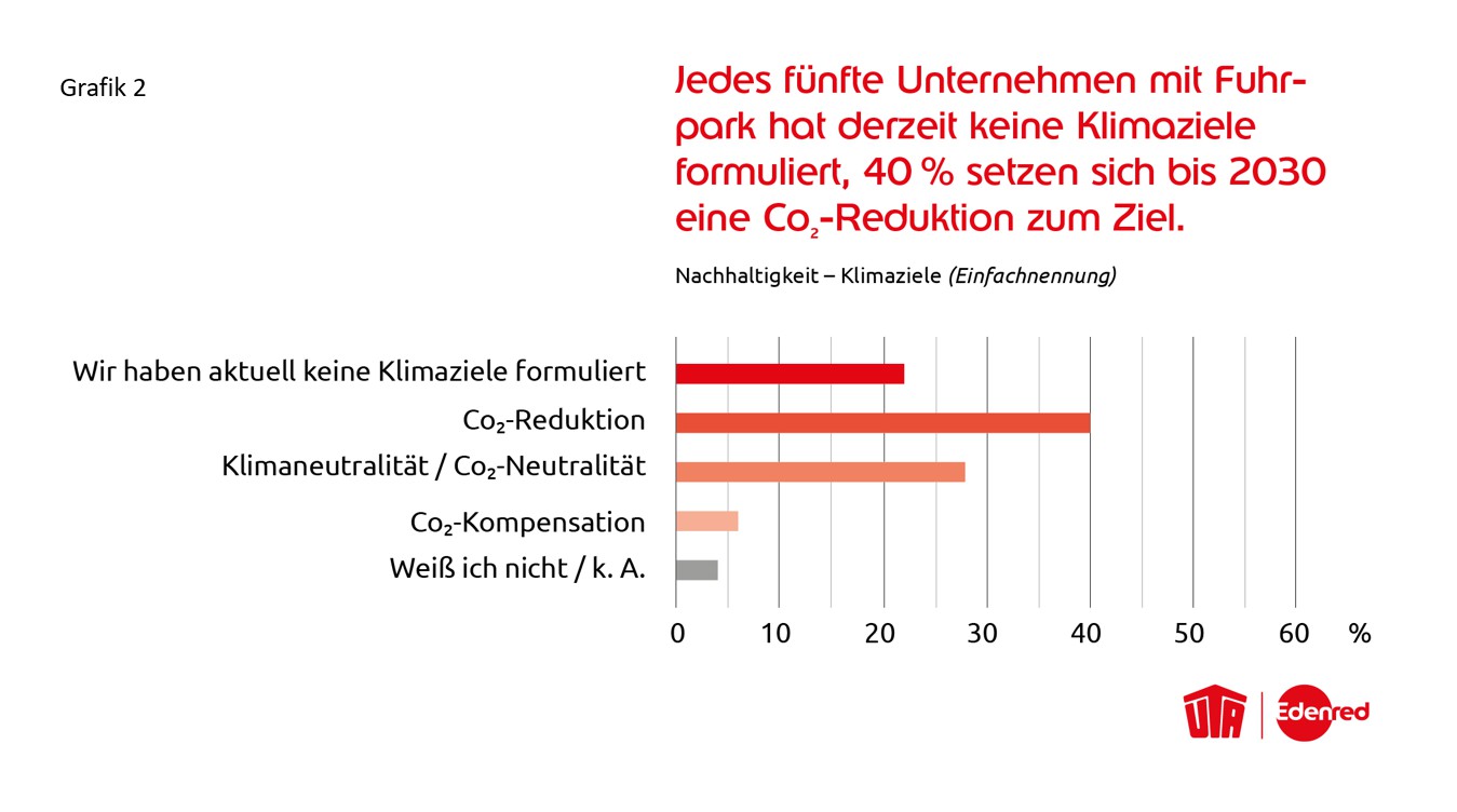 Op Duitse wegen wordt nog steeds te veel CO2 uitgestoten. Om de klimaatdoelen van de Duitse regering tegen 2030 te kunnen bereiken, moet de reductie de komende jaren aanzienlijk worden versneld. Hoewel de wagenparken van Duitse bedrijven hier aanzienlijke mogelijkheden bieden, heeft meer dan één op de vijf bedrijven (22 procent) momenteel nog geen klimaatdoelen voor hun bedrijfsvoertuigen gedefinieerd. 40 procent van de ondervraagde wagenparkbeheerders heeft daarentegen als doel gesteld om de CO2-uitstoot te verminderen, terwijl meer dan een kwart (28 procent) zich heeft voorgenomen om tegen 2030 klimaat- of CO2-neutraal te worden. (Grafiek 2)