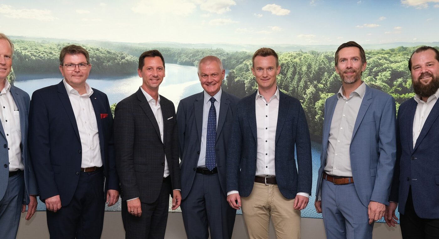 Foto: © Hafen Hamburg/Carsten Schmale / Bijschrift: De organisatoren van de vierde Dialog.Schiene.Südwestfalen. (v.l): Udo Sieverding (afdelingshoofd van het NRW-verkeersministerie), Sebastian Schilling (hoofd serviceontwerp bij DB Cargo), Andreas Müller (landraad van de Kreis Siegen-Wittgenstein), Klaus Gräbener (algemeen directeur van de IHK Siegen), Julian Mack (BVL-regionaal groepsleider), Markus Heinen (HHM-vertegenwoordiger West) en Christian Betchen (directeur, KSW Kreisbahn Siegen-Wittgenstein).