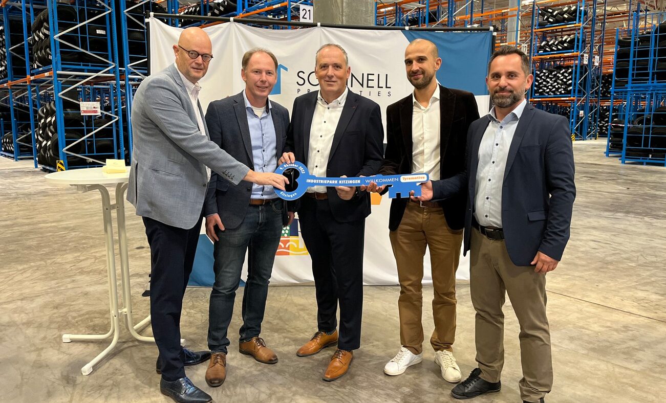 (Kitzingen) Het bedrijf Tyremotive, dat gespecialiseerd is in de verkoop van banden en wielen, vierde afgelopen maandag de officiële intrek in zijn nieuwe, hypermoderne magazijn in het Industriepark Kitzingen. Bij de feestelijke sleuteloverdracht waren onder andere vertegenwoordigers van de stad Kitzingen aanwezig, zoals de plaatsvervangende landrat Doris Paul en burgemeester Stefan Güntner, evenals partnerbedrijven van vastgoedontwikkelaar Scannell Properties en zijn Managing Director DACH en Benelux, Jordan Corynen. Hij was het ook die de symbolische sleutel voor hun nieuwe magazijn overhandigde aan de directeuren Henny Butter en Christian Leibold van de internationaal opererende velgen- en bandenhandelaar Tyremotive.