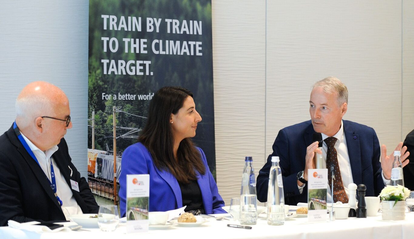 Foto: © Kombiverkehr / Bijschrift: Sophia Kircher (midden) en Kristian Schmidt (rechts) in gesprek met moderator Detlef Fechtner (links), hoofdredacteur van de Börsen-Zeitung