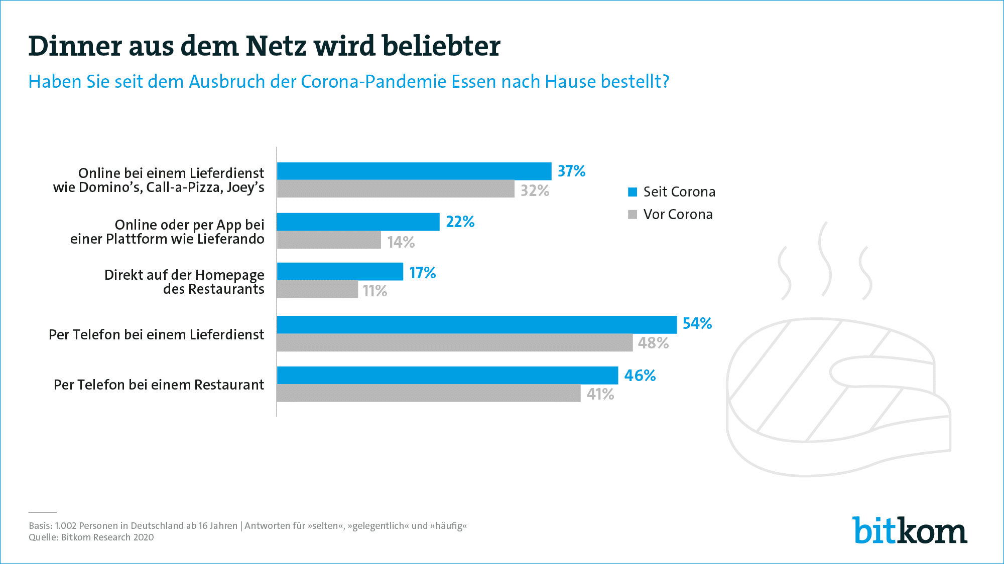 27/07/2020 às 07h00A Bitkom e.V. constatou que, desde o início da pandemia de Corona, mais pessoas estão pedindo comida para casa. Muitos ainda trabalham em home office e outros têm medo de se infectar em restaurantes. Surpreendentemente, o pedido clássico por telefone ainda é mais comum do que o pedido pela web.