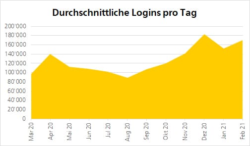 Interessante também é o desenvolvimento do login do cliente dos Correios, a porta de entrada para os serviços online. Cada vez mais clientes utilizam um acesso pessoal aos serviços digitais do mundo amarelo, e o número de logins está aumentando significativamente. Isso significa que os serviços online estão sendo utilizados com mais frequência. Em janeiro de 2020, havia pouco mais de 80 000 logins diários, enquanto em dezembro a média era de mais de 183 000 logins por dia – 21 por cento a mais em comparação ao ano anterior de 2019. O recorde absoluto ocorreu em 1 de dezembro de 2020 – com 280 823 logins. “Cada vez mais clientes reconhecem como podem tornar seu dia a dia mais fácil graças ao login e ao uso dos serviços digitais dos Correios”, conclui Jürgen Kübler.