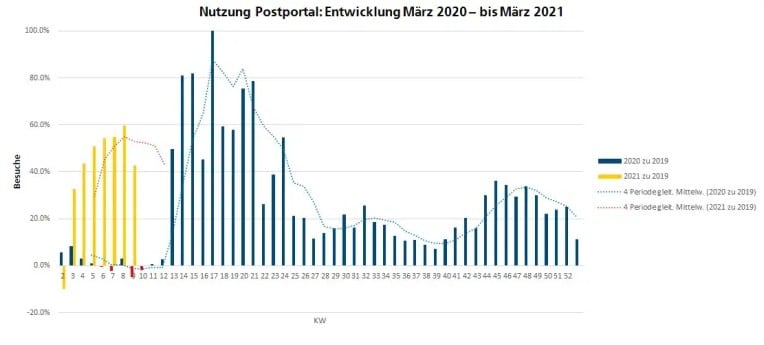 (Berna) Lojas fechadas e teletrabalho em grande escala: Quando a Suíça entrou no primeiro lockdown há um ano e o sistema foi amplamente encerrado, as curvas de muitos portais da Internet rapidamente dispararam. O impulso da digitalização acelerou desenvolvimentos em muitos setores em um curto espaço de tempo, em alguns casos, por vários anos. Ao mesmo tempo, isso resultou em uma verdadeira avalanche de pacotes e muito trabalho para os Correios. Mesmo no mundo digital, eles mostraram-se resistentes à crise, e o boom online impulsionou as ofertas digitais do maior fornecedor de logística da Suíça: site, serviços online, os vários canais digitais – os acessos aumentaram drasticamente a partir de meados de março de 2020, estabilizando-se um pouco depois em um nível elevado, antes de a curva voltar a subir devido às medidas mais rigorosas no outono. “2020 foi também um ano recorde para nós em termos digitais”, diz Jürgen Kübler, chefe de Gestão de Canais Digitais Externos nos Correios.