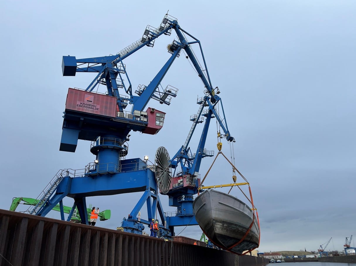 (Dresden) Há várias semanas, extensas medidas preparatórias foram tomadas pela SBO em colaboração com a empresa Scholz Recycling, localizada no porto, para preparar a última viagem da “Atlantis”. Após o navio ter sofrido várias avarias no porto, o levantamento final da bacia do porto não foi nada fácil. O maior desafio foi estimar o peso desconhecido do navio, para que os dois guindastes do porto pudessem levantá-lo em tandem. Para isso, houve apenas uma tentativa, que precisava ser bem-sucedida.