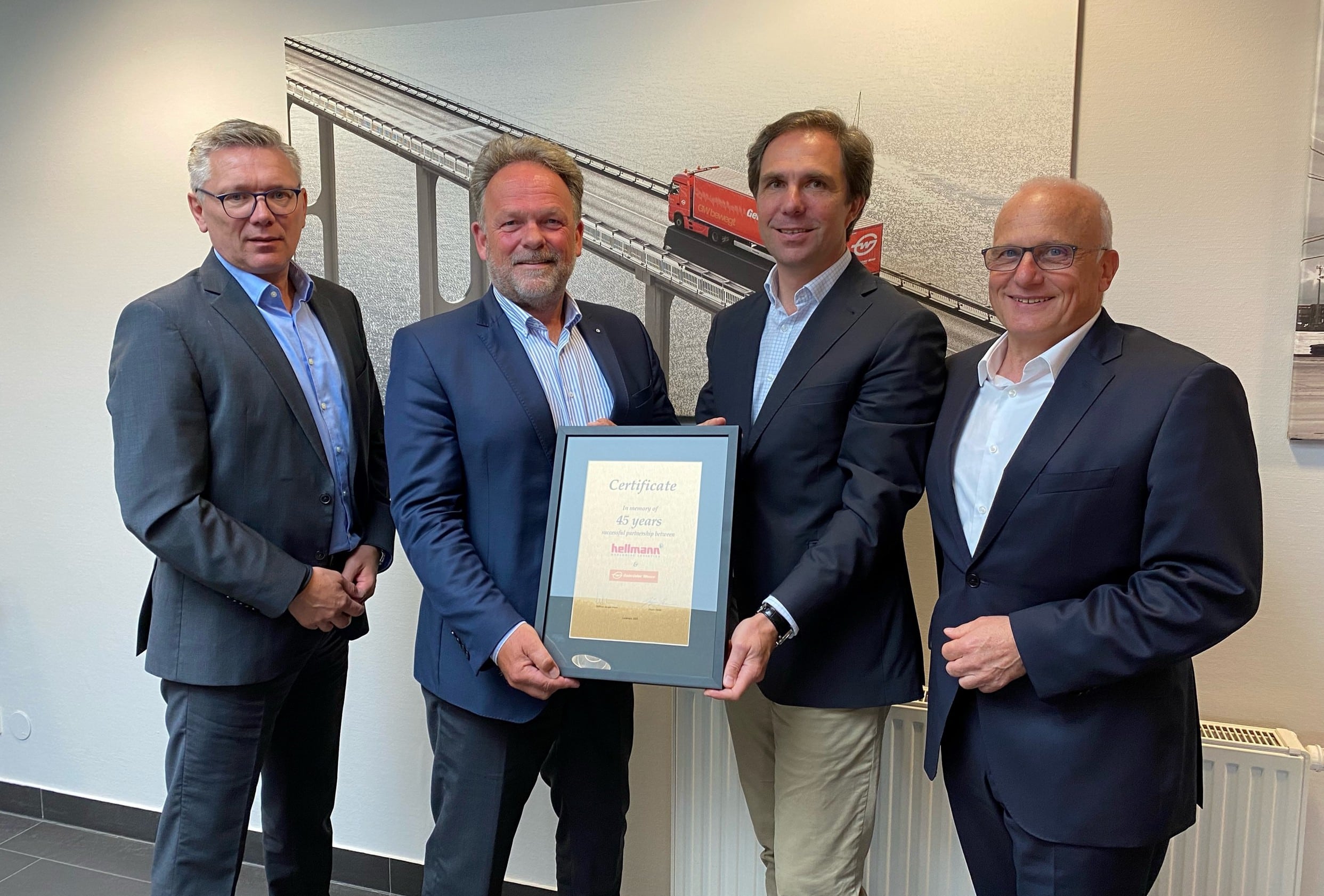 Foto: © Gebrüder Weiss / Legenda da imagem: (esq. para dir.): Jörg Herwig (COO) e Reiner Heiken (CEO), ambos da Hellmann, e Wolfram Senger-Weiss (presidente da diretoria) e Walter Konzett (diretor de gerenciamento de produtos de transporte terrestre), ambos da Gebrüder Weiss.