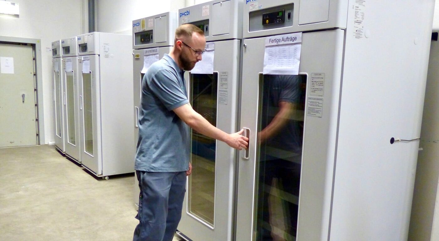 Os funcionários da Movianto são especialmente treinados para lidar com todos os itens a serem armazenados nos refrigeradores validados. “Cada abertura de um refrigerador, cada preenchimento e cada retirada deve ser documentada.” Todo o armazém da Movianto em Neunkirchen é monitorado por vídeo. A área de substâncias controladas é adicionalmente segura. Apenas funcionários específicos têm acesso. Como um enorme cofre, as entradas são protegidas por portas de aço maciço. As paredes, que têm até meio metro de espessura, estão equipadas com sensores de vibração que imediatamente transmitem tentativas de arrombamento como um alarme silencioso para a polícia.