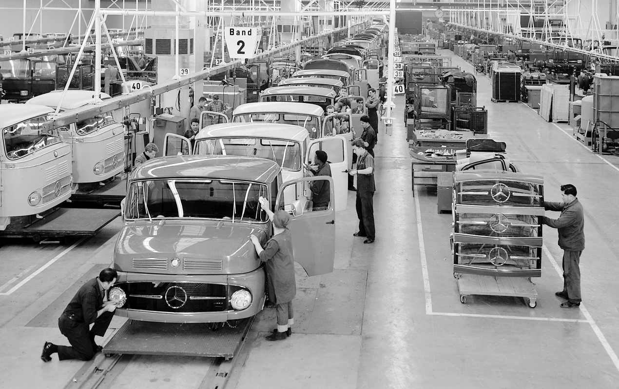 (Wörth am Rhein) Inicialmente, foram fabricadas cabines de caminhões, que na época ainda eram enviadas para montagem adicional nas fábricas de Gaggenau (caminhões pesados) ou Mannheim (caminhões médios e leves). A partir de 1965, Wörth se tornou o foco da produção de veículos comerciais da Mercedes-Benz. Na fábrica de montagem central, agora veículos completos eram montados e entregues. As localizações de Gaggenau e Kassel se especializaram na construção de transmissões e eixos para caminhões, enquanto Mannheim se concentrou em motores e na produção de ônibus.