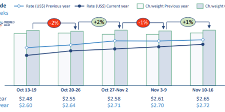 In week 46, airfreight rates increased ahead of Black Friday and Thanksgiving, driven by rising demand from Southeast Asia to the US and Europe. Average spot rates from Asia Pacific rose by 4% week-on-week to USD 4.11 per kg, while tonnages from this manufacturing hub also saw a 1% increase. Rates from Asia Pacific to the US reached USD 5.51 per kg, boosted by recoveries in tonnages and prices from Japan, South Korea and Vietnam. Despite an 11% year-on-year decline in average spot rates since April, demand remains strong due to high Chinese e-commerce exports and a trend towards Southeast Asian suppliers.